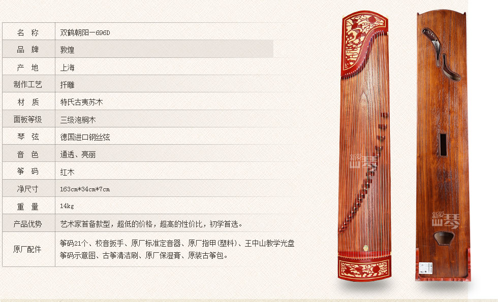 名(ming) 稱 雙鶴朝陽(yang)一696D 品 牌 敦煌 產 地 上海 制作工藝 扦(qian)雕(diao) 材 質 特氏古夷蘇木 面板等級 三級泡桐木 琴弦 德國進(jin)口鋼(gang)絲弦 音色(se) 通透、亮麗(li) 箏 碼 紅木 凈尺寸(cun) 163cm*34cm*7cm 重 量 14kg 產品優勢 藝術家(jia)首備款(kuan)型,超(chao)低的價格,超(chao)高的性價比,初(chu)學首選。箏碼21個、校音扳(ban)手(shou)、原廠標準(zhun)定(ding)音器、原廠指甲(塑料)、王(wang)中山教學光盤 箏碼示意圖、古箏清潔刷、原廠保濕膏(gao)、原裝