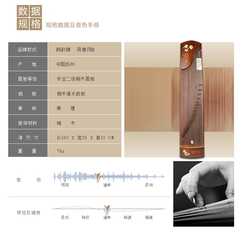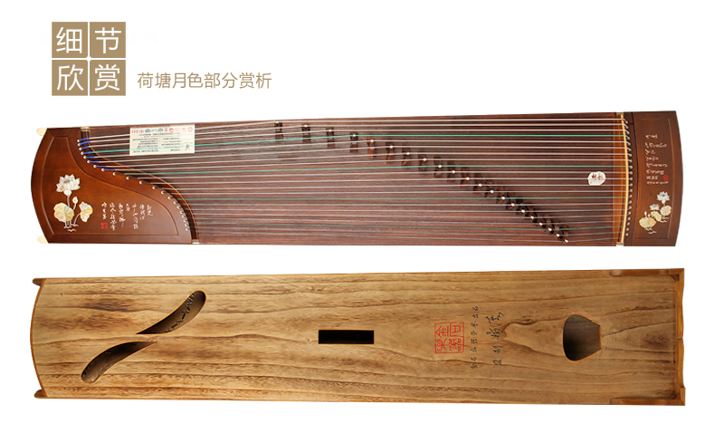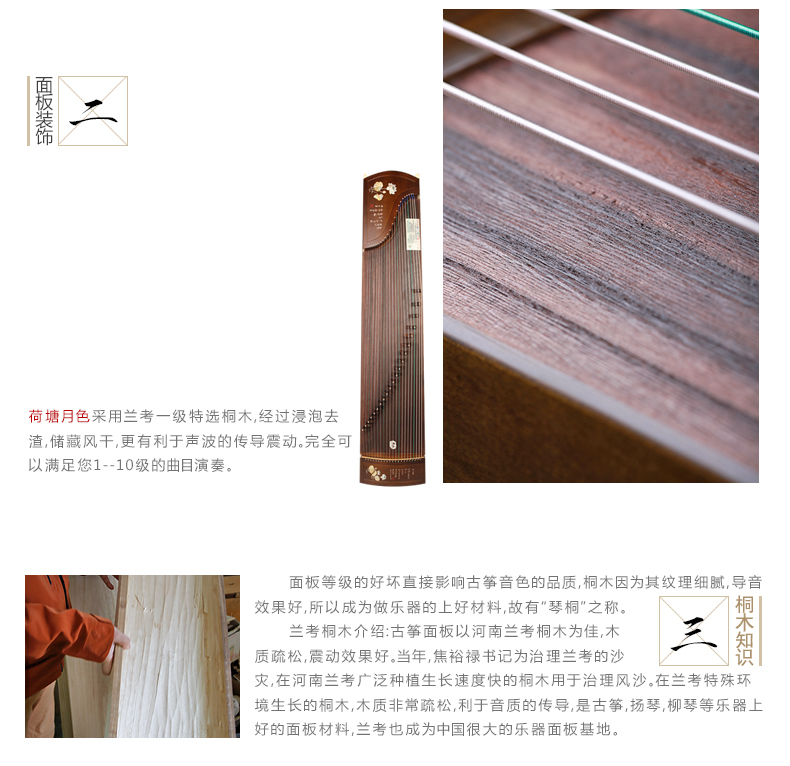 荷塘月色采用蘭考一級特選桐木經過浸泡去渣儲藏風干更有利于聲波的傳導震動。完全可以滿足您1--10級的曲目演奏