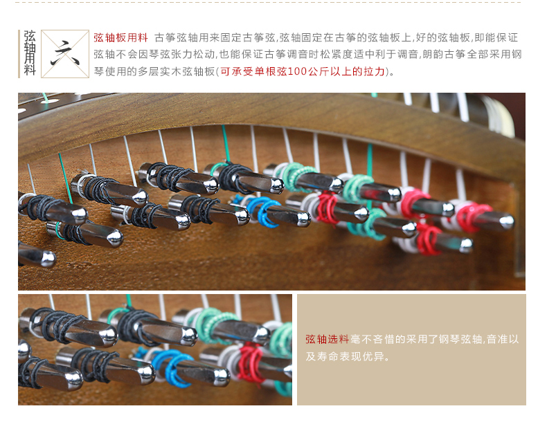 弦軸板用料古箏弦軸用來固定古箏弦弦軸固定在古箏的弦軸板上好的弦軸板,即能保證弦軸不會因琴弦張力松動也能保證古箏調音時松緊度適中利于調音朗韻古箏全部采用鋼琴使用的多層實木弦軸板(可承受單根弦100公斤以上的拉力)。