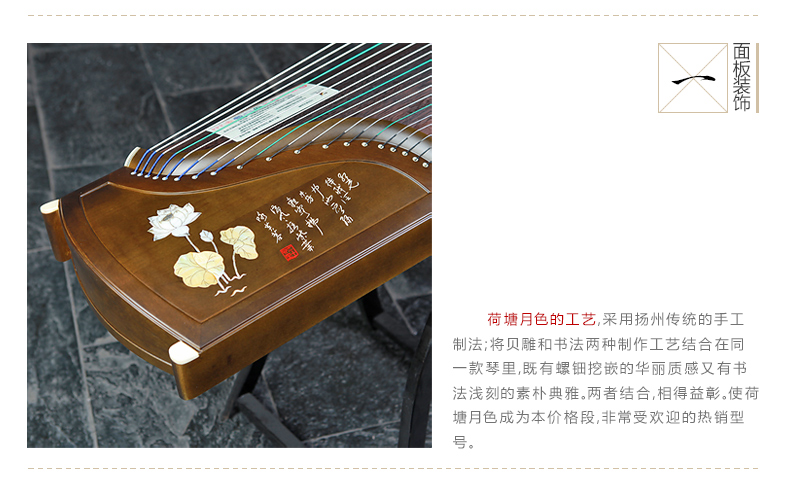 荷塘月色的工藝采用揚州傳統的手工制法將貝雕和書法兩種制作工藝結合在同一款琴里既有螺鈿挖嵌的華麗質感又有書法淺刻的素樸典雅。兩者結合相得益彰。使荷塘月色成為本價格段非常受歡迎的熱銷型荷塘月色采用蘭考一級特選桐木經過浸泡去渣儲藏風干更有利于聲波的傳導震動。完全可以滿足您1--10級的曲目演奏桐木知識:面板等級的好壞直接影響古箏音色的品質,桐木因為其紋理細膩,導音效果好所以成為做樂器的上好材料,故有&q