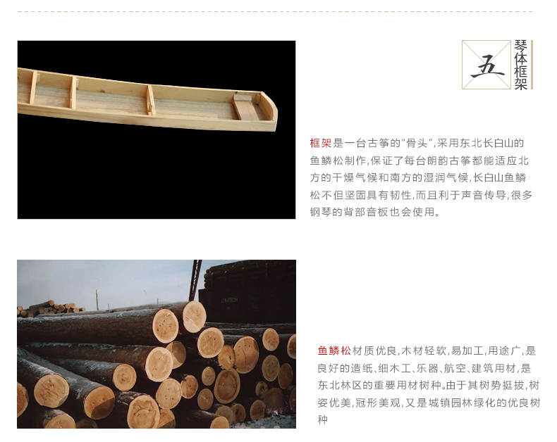 框架是一臺古箏的骨頭”采用東北長白山的魚鱗松制作保證了每臺朗韻古箏都能適應北方的干燥氣候和南方的濕潤氣候,長白山魚鱗松不但堅固具有韌性而且利于聲音傳導很多鋼琴的背部音板也會使用。