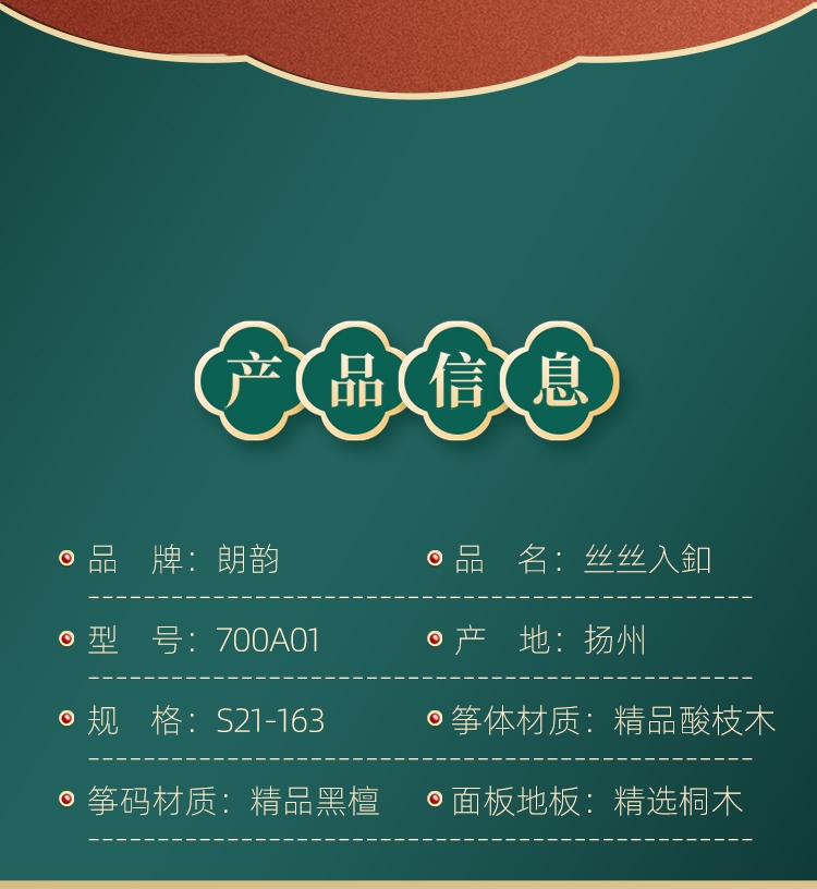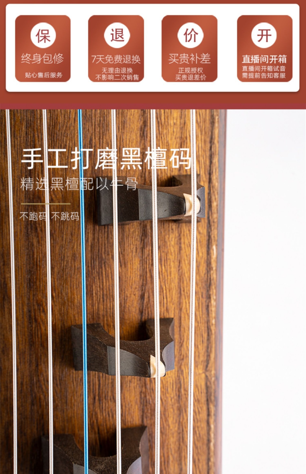 型號:700A01產地:揚州規格:S21-163箏體材質:精品酸枝木箏碼材質:精品黑檀面板地板:精選桐木