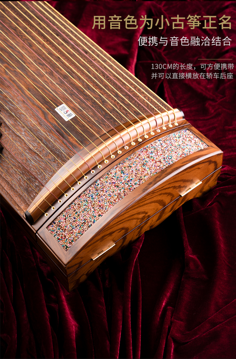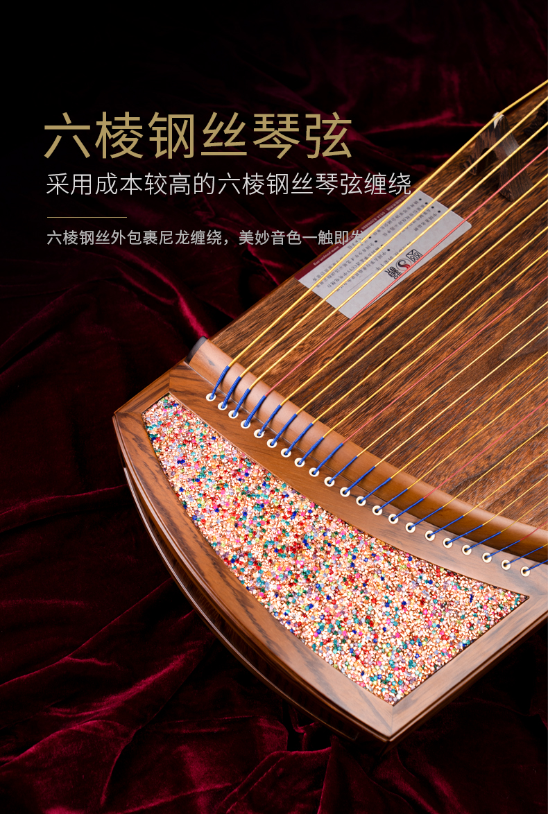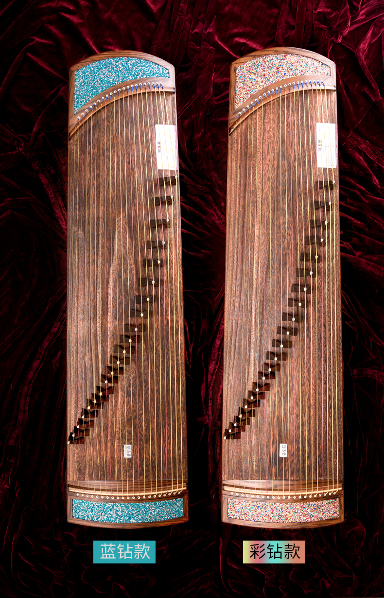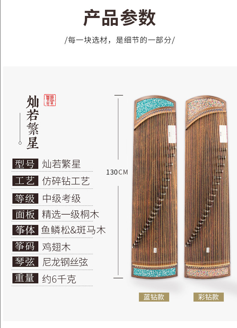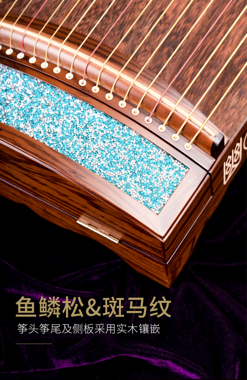型號 燦若繁星工藝 仿碎鉆工藝等級 中級考級面板 精選一級桐木箏體 魚鱗松&斑馬木箏碼 雞翅木琴弦 尼龍鋼絲弦重量 約6千克