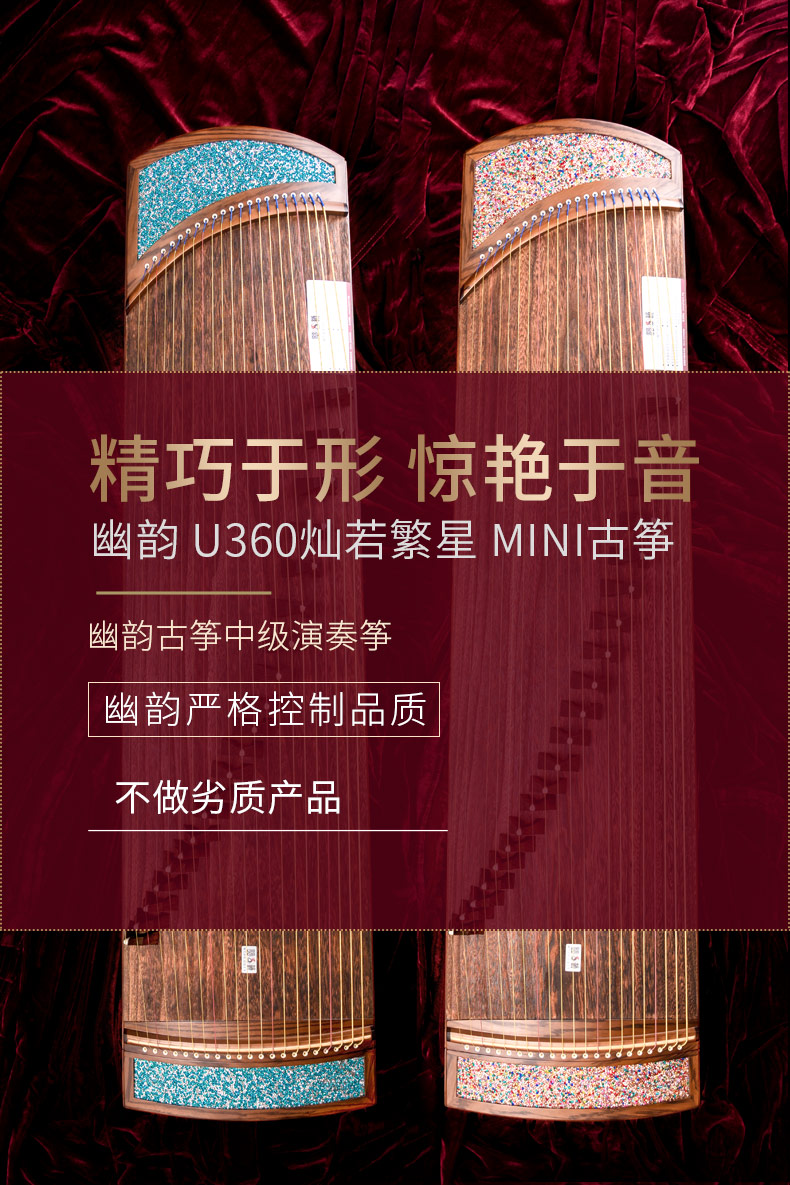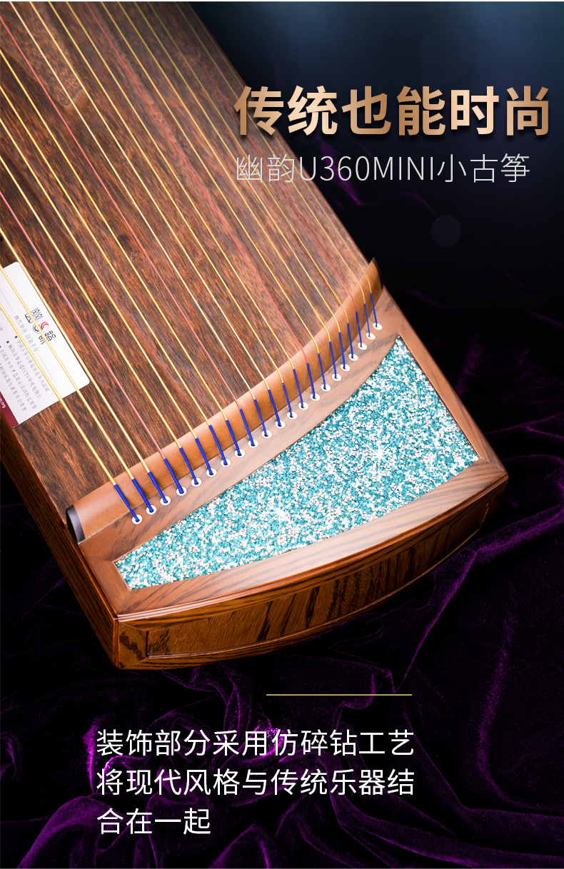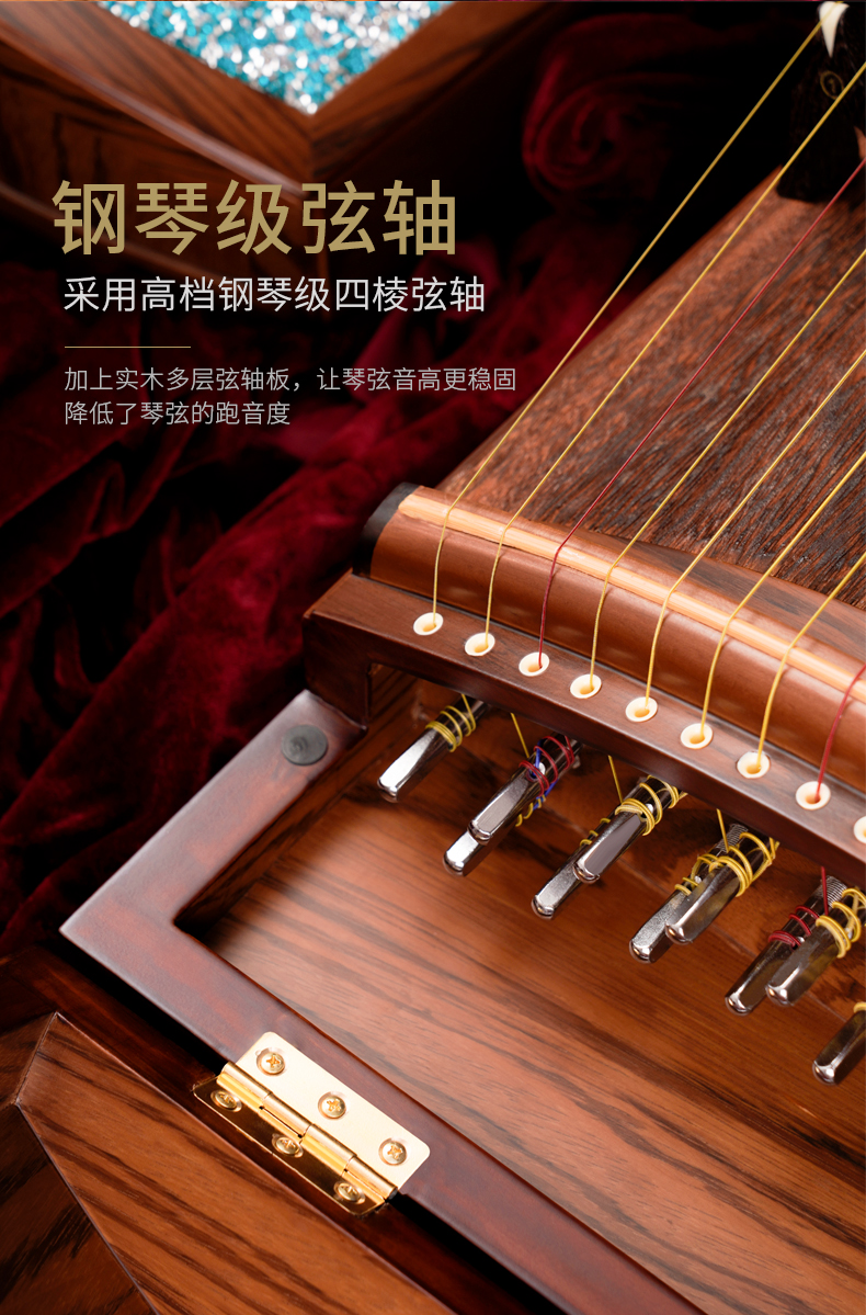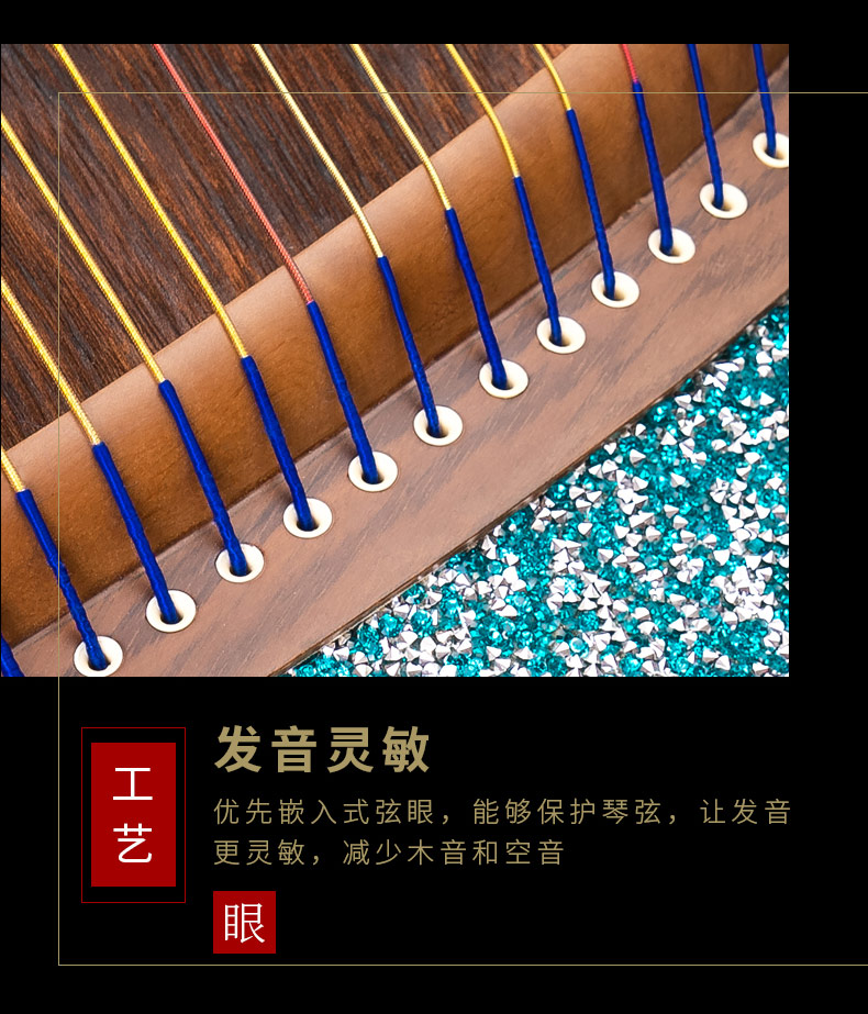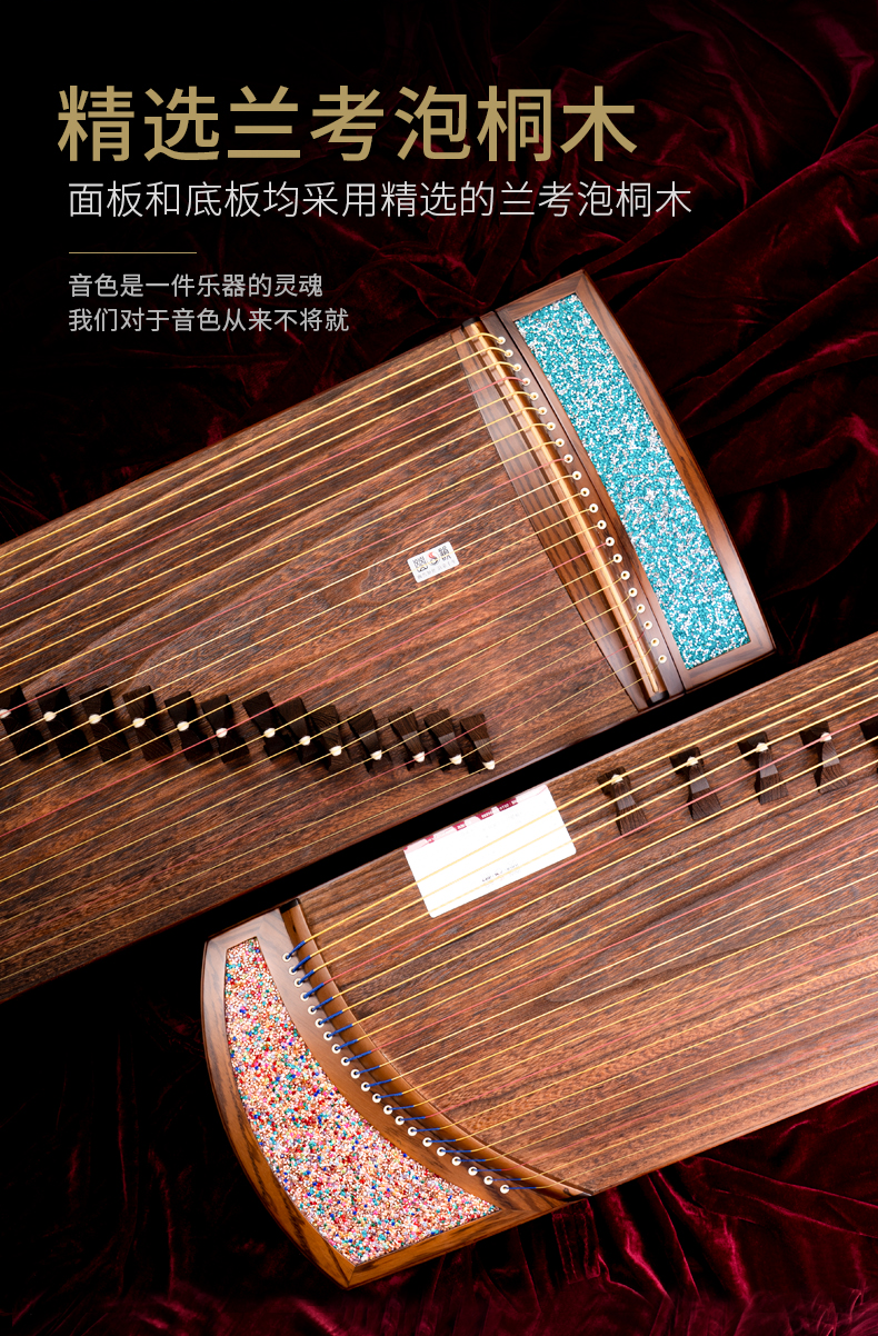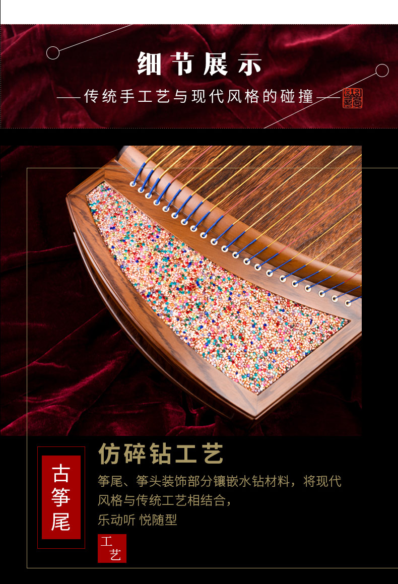 型號 燦若繁星工藝 仿碎鉆工藝等級 中級考級面板 精選一級桐木箏體 魚鱗松&斑馬木箏碼 雞翅木琴弦 尼龍鋼絲弦重量 約6千克
